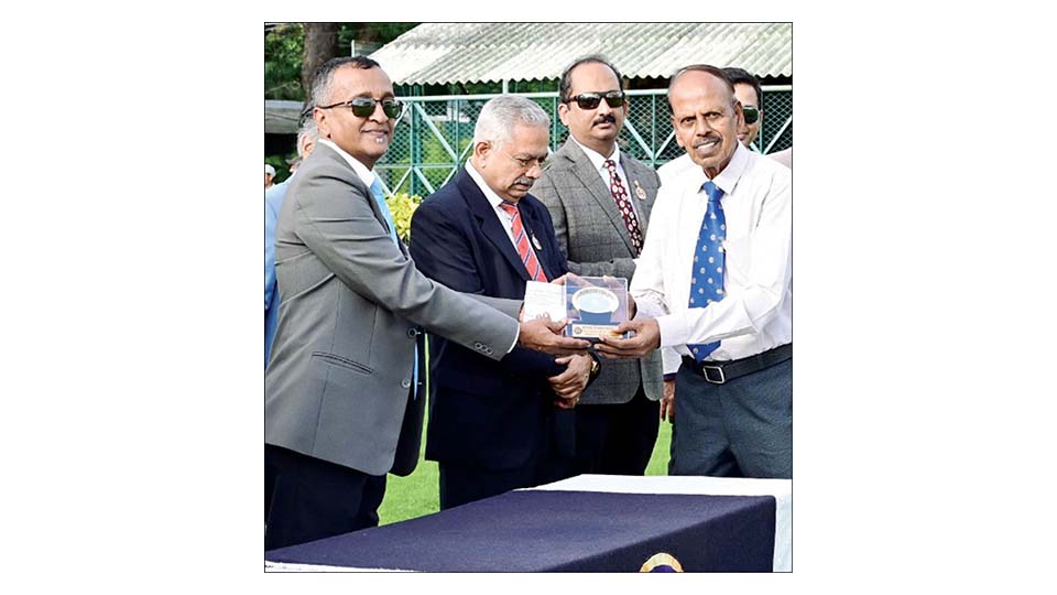 Tipster P.G. Chandrashekar (PGC), Racing Correspondent of Star of Mysore and Mysuru Mithra, seen receiving ‘Tipster Tally Prize’ from Mysore Race Club (MRC) Committee Member Dr. A.S. Ajit Kumar Raj Urs in the presence of MRC Chairman G. Venkatesh, Stewards and Committee Members.